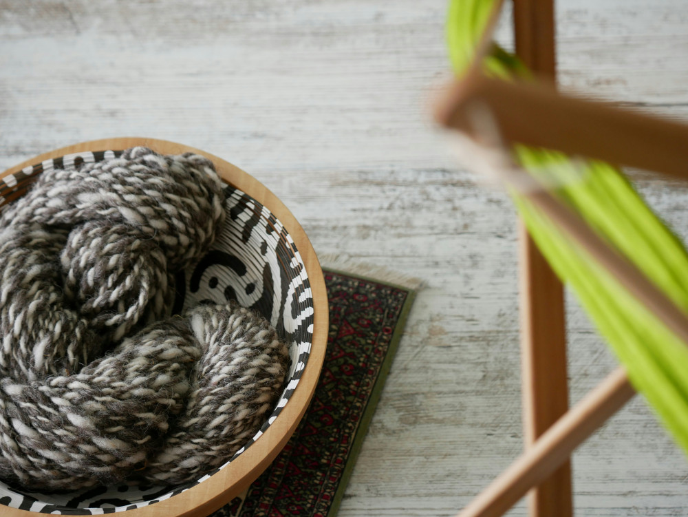 Skålen er udskåret med to huller og en spiralformet åbning, som gør det muligt at føre garnet igennem, så tråden holdes på plads under arbejdet. Det mindsker risikoen for, at garnet filtrer sig sammen eller ruller væk.